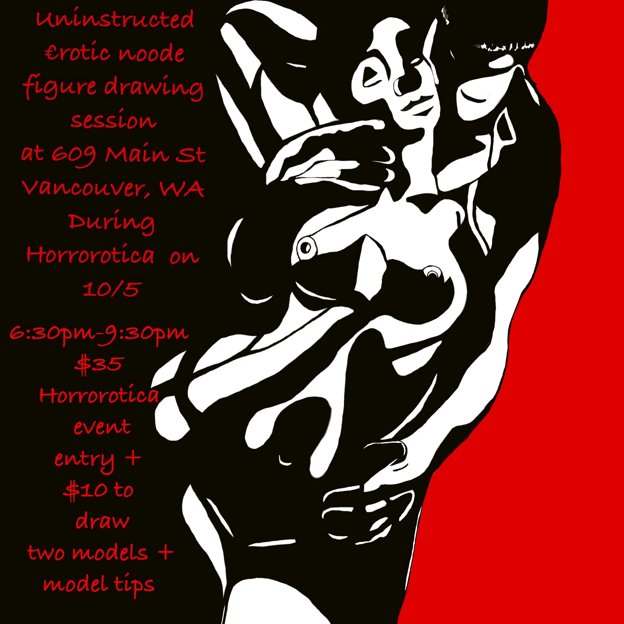 This uninstructed erotic nude figure drawing class will be on October 5th from 6:30pm to 9:30pm at 609 main st in Vancouver, WA during Horrorotica.