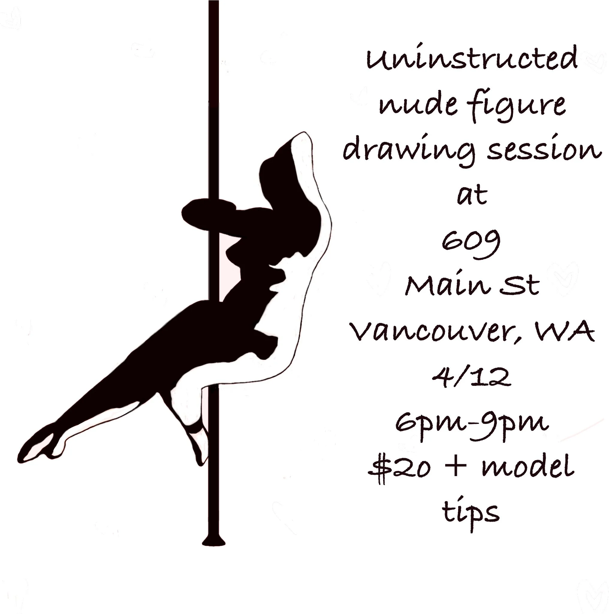 This uninstructed nude figure drawing class will be on April 12th from 6pm to 9pm at 609 Main St in Vancouver. WA.